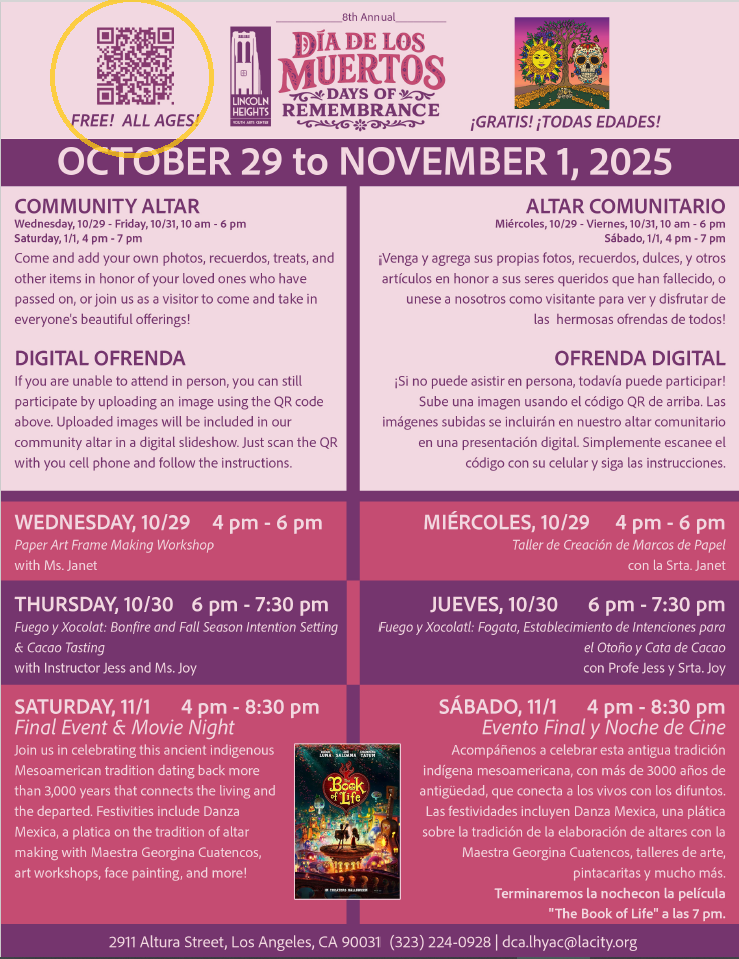 Lincoln Heights Youth Arts Center (LHYAC) invites you to the 8th Annual Día de Los Muertos Days of Remembrance (October 29 and 30, and November 1, 2025)! LHYAC will have various ways for you to engage in this important cultural tradition, including coming to visit LHYAC's annual indigenous ofrenda created with local ancestral healer, Georgina Cuatencos, in our front courtyard. Check out our schedule of activities below and see you soon!