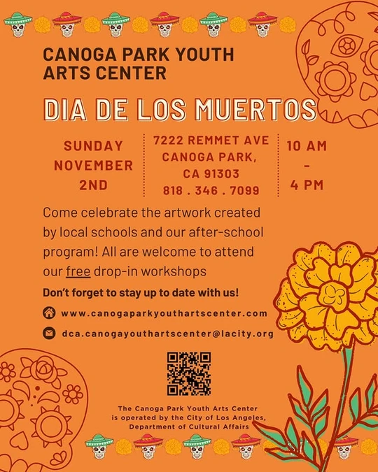 Celebrate Día de los Muertos at the Canoga Park Youth Arts Center (CPYAC)! Our exhibition will feature altars, a mini city, and artwork created by our local schools and our afterschool program. Enjoy free art workshops for all ages.