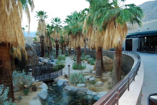 The Oasis Trail is a permanent outdoor exhibition located in the middle of the Agua Caliente Cultural Plaza, that includes native plants, rock formations, and water features inspired by those found in the Agua Caliente Indian Canyons and Tahquitz Canyon. These canyons make up part of the Tribe's ancestral lands. Interpretive signs providing information about traditional plant usage demonstrate how the Agua Caliente Band of Cahuilla Indians have thrived in this area since time immemorial.