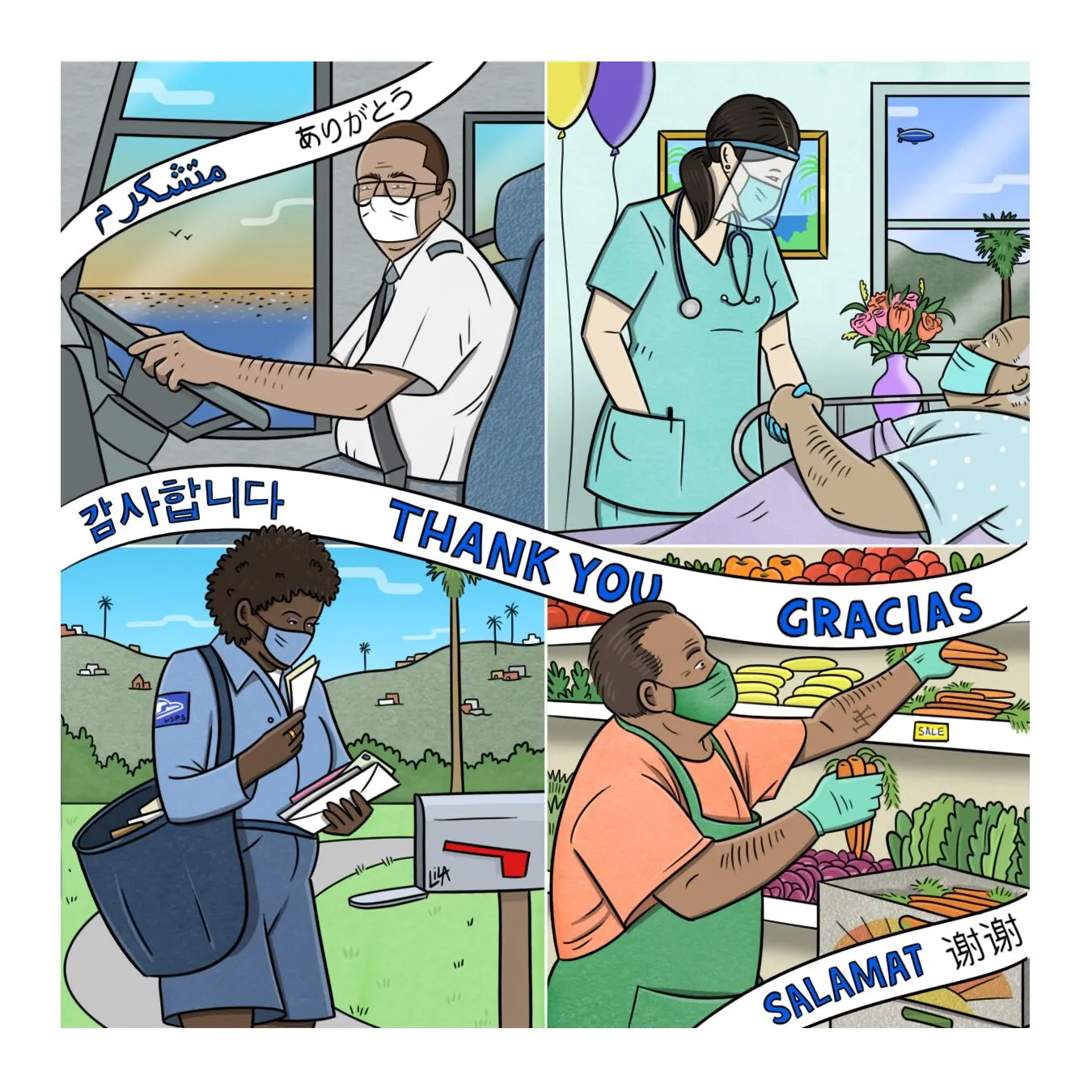 “This piece is a ‘thank you’ to the essential workers who have put themselves at risk to be of service to people throughout Los Angeles. I have included the words ‘thank you’ in Farsi, Korean, Chinese, Japanese, Tagalog, English, and Spanish to represent a few of the languages most commonly spoken by the people of Los Angeles. During this pandemic, I have been very aware of the sacrifices made by grocery workers, medical professionals, mail carriers, public transit operators and so many others. I wanted my piece to be a message of gratitude to all of those who have been a true lifeline for me and the city at large during these uncertain and often scary times.” —LA